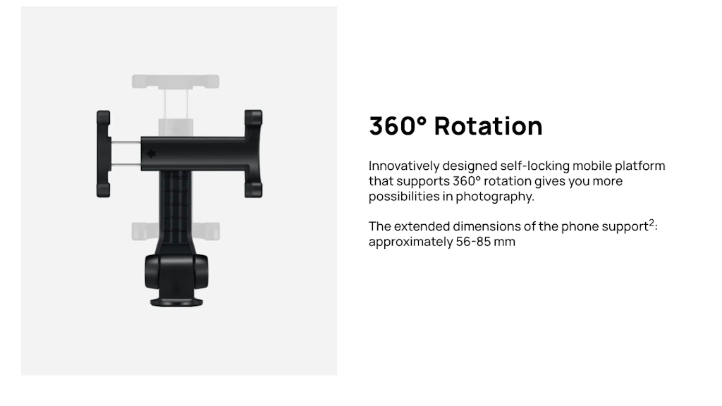 - Adjustable 4-point smartphone clamp that can rotate freely in 360 degree.
