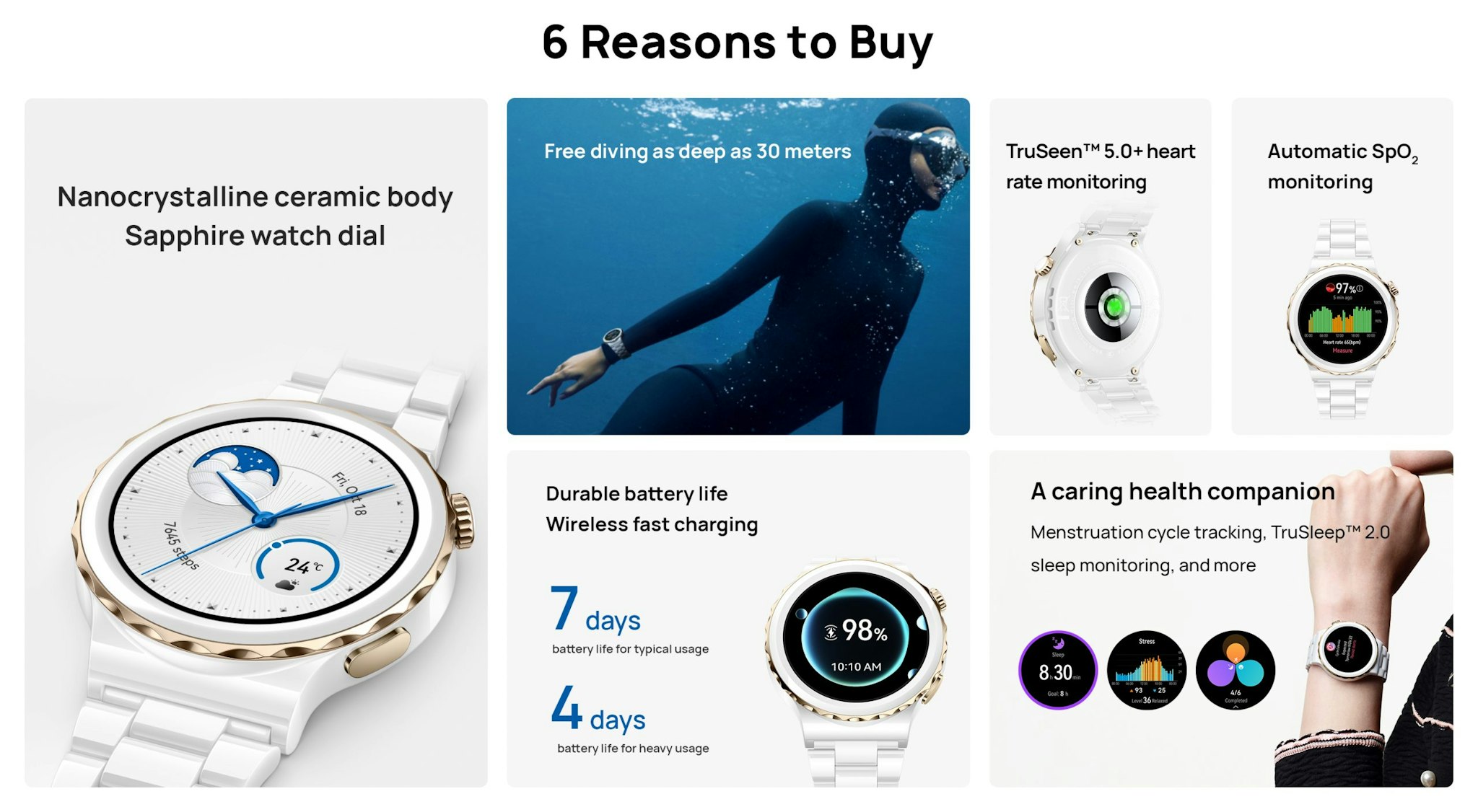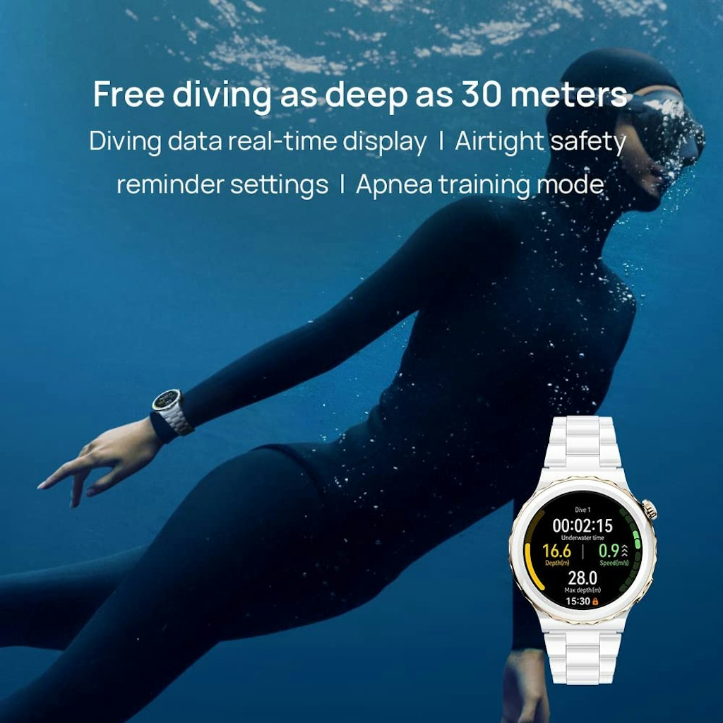 - 5ATM water resistance (tested for waterproof up to 30 m**), and can be used for water activities such as swimming pools,seaside swimming***, and diving.